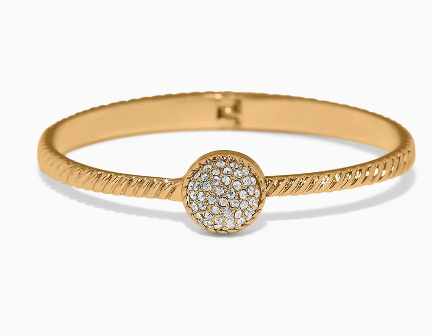 What a stunner; this hinged bangle has a bulbous encrusted pavé dome encircled by fine minuscule roping sitting at the heart of this roped hinged bangle. The perfect jewelry piece to finish off your outfit.