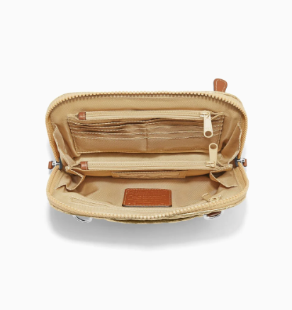 This featherweight that is quilted in heart-shaped nylon is adorable, rollable, packable and will bounce right back into shape. A secure ziptop, 2 exterior and 4 interior pockets and 8 credit card slots/ID window make it ultra-practical. It has a detachable/adjustable crossbody strap.