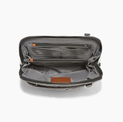 This featherweight that is quilted in heart-shaped nylon is adorable, rollable, packable and will bounce right back into shape. A secure ziptop, 2 exterior and 4 interior pockets and 8 credit card slots/ID window make it ultra-practical. It has a detachable/adjustable crossbody strap.