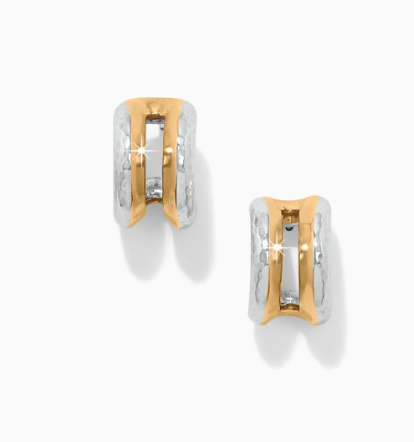 Sculptural, ear-hugging hoops feature hammered silver and high shine gold inlay. Understated and versatile, with its mixed metal motif inspired by Renaissance-period jewelry of the influential Medici family.