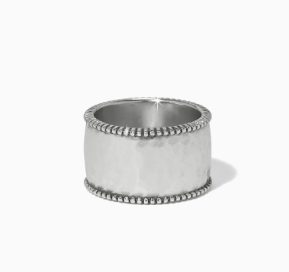 This cigar band style ring is a standout addition to the Pretty Tough Gem collection. A symbol of strength and sophistication, the design is inspired by the bands found on cigars, which were once considered symbols of opulence and exclusivity. The lightly hammered silver foundation is outlined with a fine row of granulation and in laid at center with a single stone baguette.