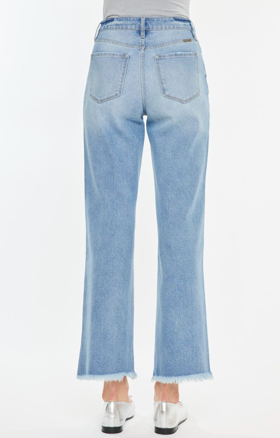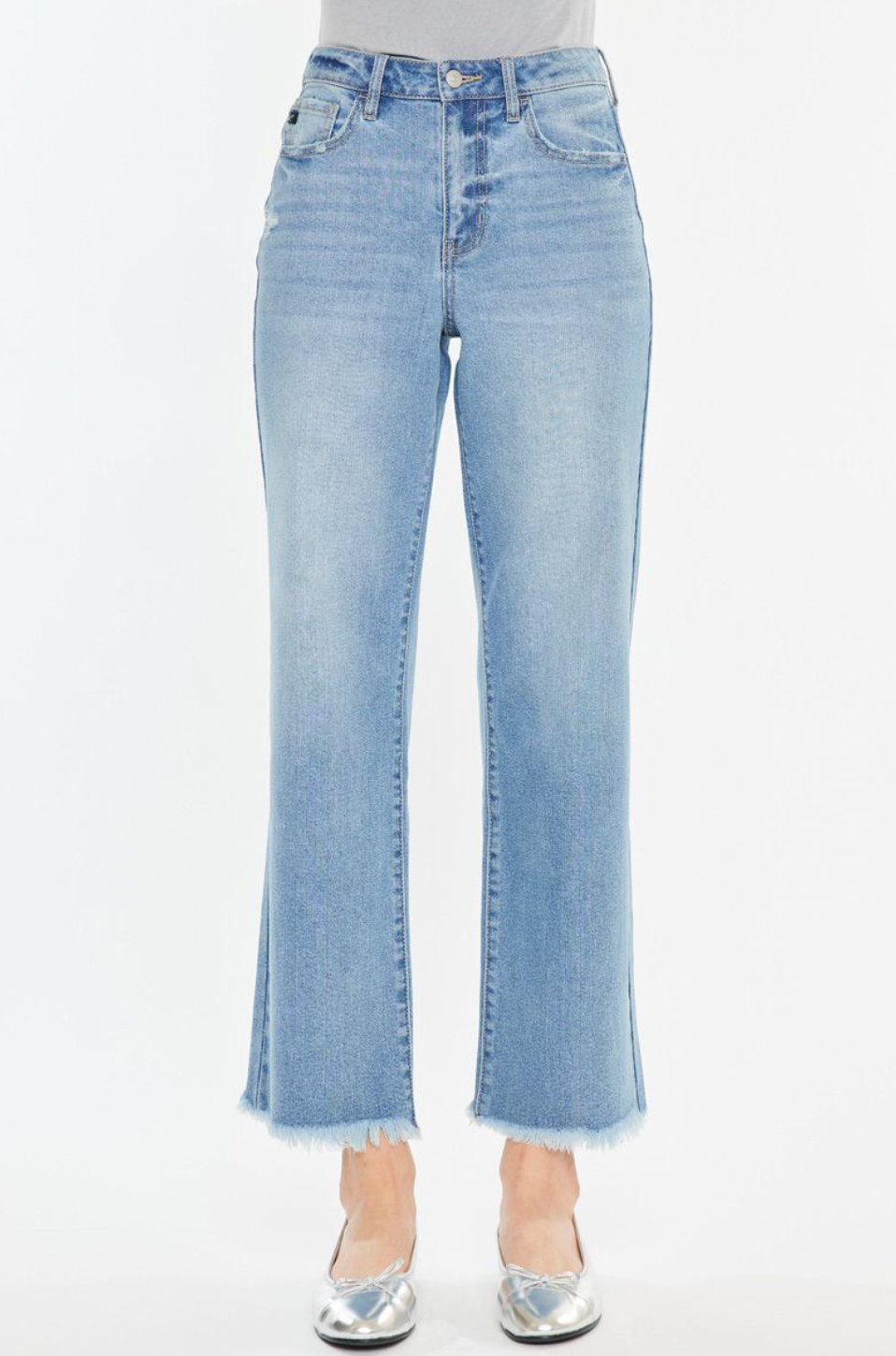 HIGH RISE SLIM WIDE LEGMEDIUM WASHCOMFORT STRETCH5 POCKET STYLEZIPPER FLYFRAYED HEMRISE 11" INSEAM 28 IN SIZE 5/2667% COTTON, 30% POLYESTER, 2.5% RAYON, 0.5% SPANDEX