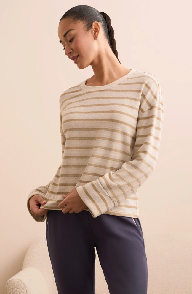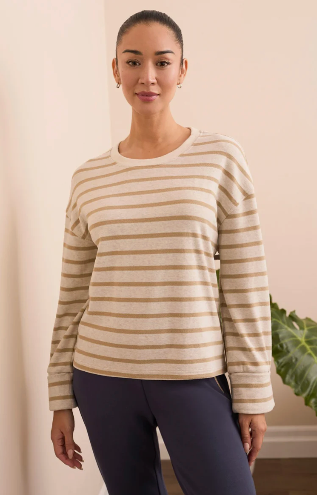 Step into ultimate comfort with this cozy brushed knit top, featuring a timeless striped pattern with a hint of nautical charm. The ultra-soft fabric makes it a perfect everyday favorite, while a classic crew neckline and cuffed sleeves complete the look with effortless ease.