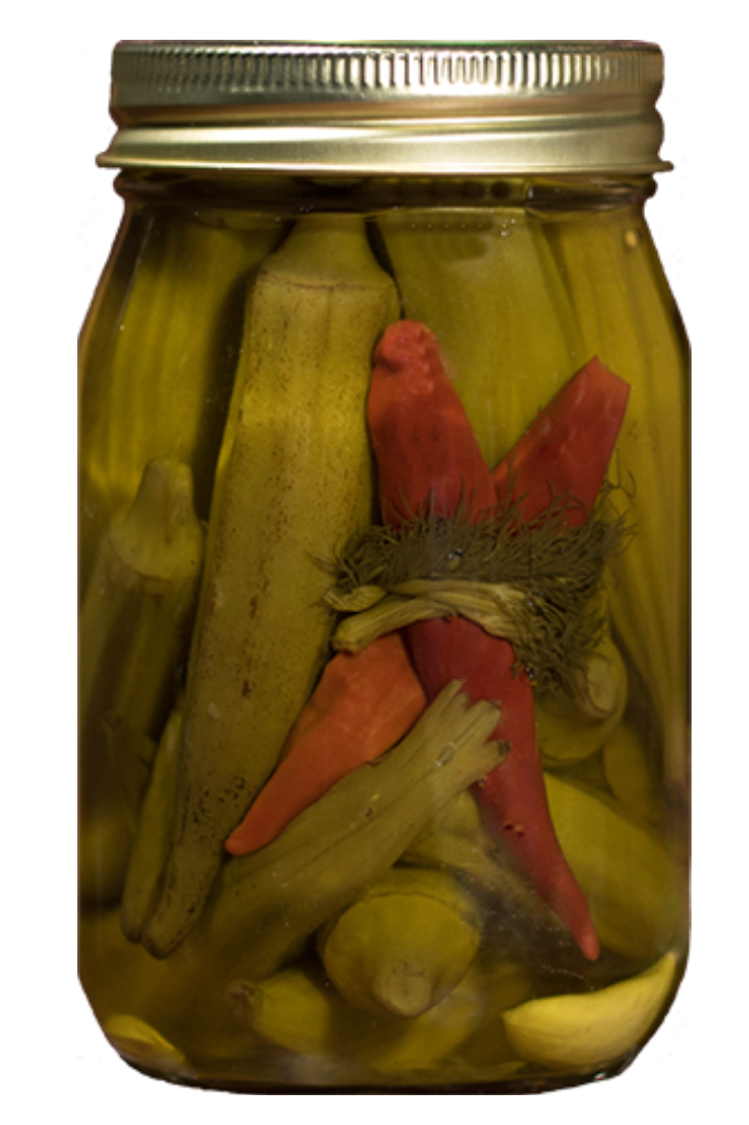 Ingredients: Okra (okra, distilled vinegar, salt, onions, garlic, mustard seeds, peppers, spices, calcium chloride, 1/10 of 1% sodium benzoate (as preservative), and yellow #5 food color), water, distilled vinegar, salt, garlic, dill weed & jap peppers.