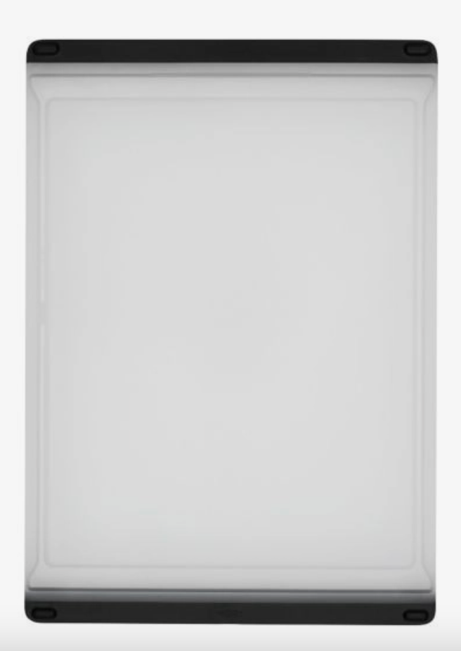 The OXO Good Grips Everyday Cutting Board is just the right size for dicing onions, slicing meat, preparing fruit salad and more. Non-porous construction locks out odors for a fresh cutting surface that resists deep scratches and goes easy on your knives. This double-sided board has a solid side for produce and a grooved side for meat, plus a drip catcher with easy-pour corners to take care of liquid run-off. Soft, tapered edges double as a comfortable handle, while non-slip feet keep the board in place as you slice. Dishwasher safe.