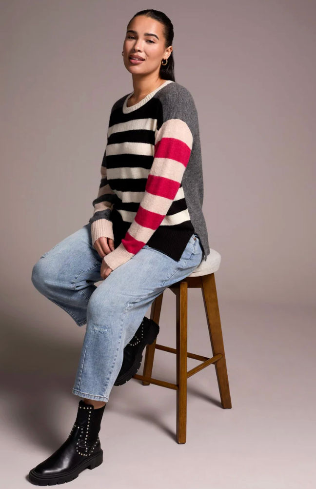 Reach for this warm long-sleeve sweater when temperatures dip and you're after cozy comfort. The boat neckline adds an elegant touch, while the combination stripe pattern brings nautical-inspired charm. The hairy yarn is luxuriously soft, providing a comfortable feel on cool days.