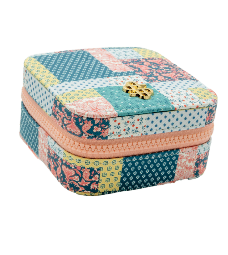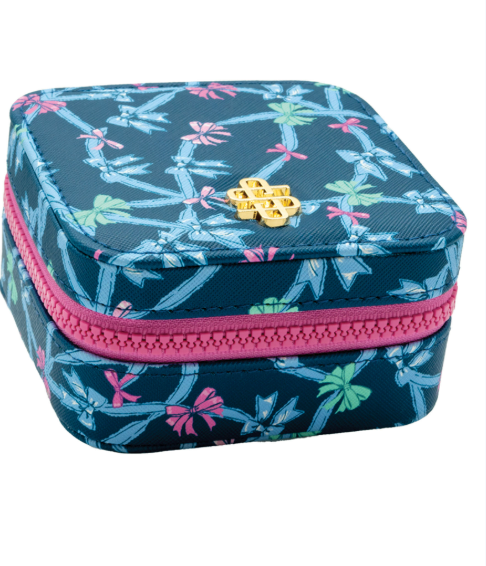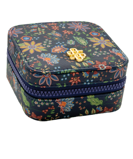 This printed jewelry box is the perfect place to store your jewelry at home or throw in a suitcase for travel. Featuring soft interior, ring, earring, and necklace storage with an interior mirror, gold hardware and Simply Southern logo. Made of 60% PVC 40% polyester.