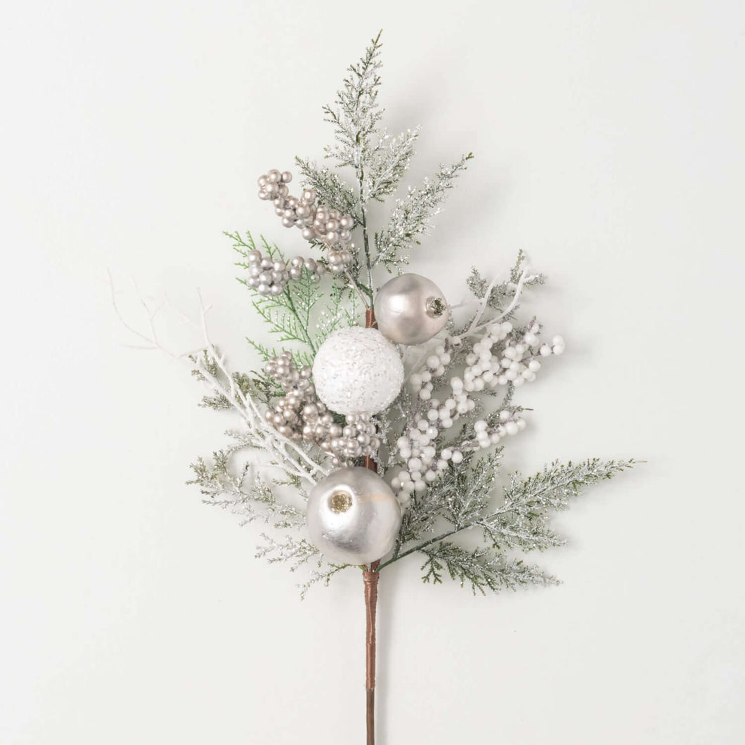 This wintery elegant flocked collection is iced with snow & accented with berries & bulbs. Designed with natural pine that has been frosted to coordinate exquisitely with silvery-white details, this 28" spray will look amazing in your decor year after year.